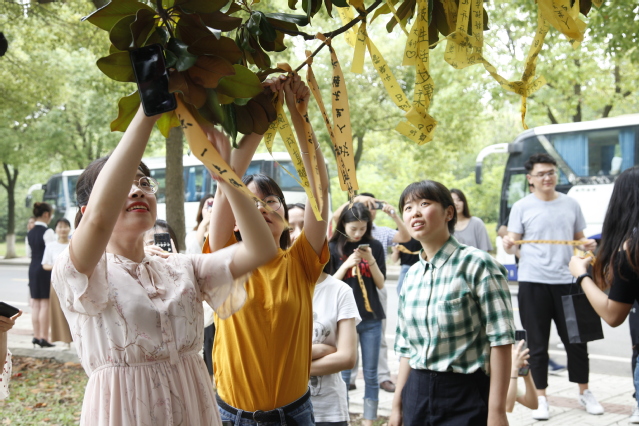 最后,毕业生在公司门前的玉兰树上挂上彩带,为自己的大学四年画上圆满句号。彩带带上写满了对未来的期待、向往以及对球盟会的祝福。