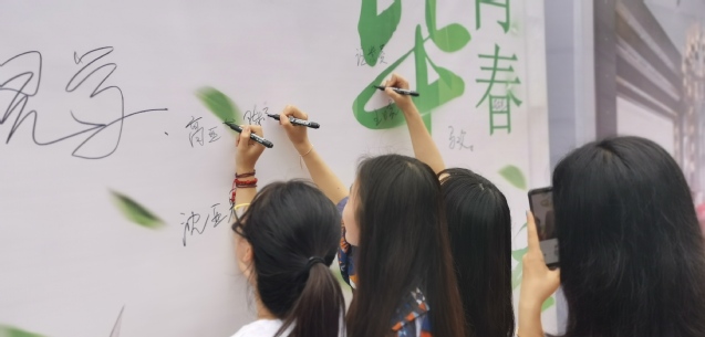 毕业典礼在毕业生们的歌曲串烧中推向高潮,歌声唱出了同学情谊、无悔记忆,在歌声中,大家纷纷在留念石、签名墙上留下自己的印记,四年的感情已深深印在了这道墙上。