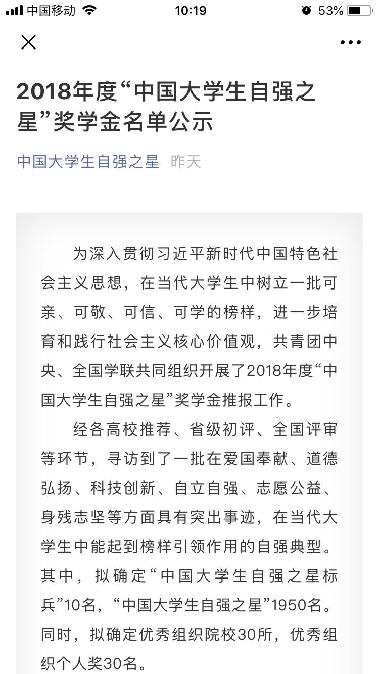 近日,共青团中央、全国学联主办的2018年度“中国老员工自强之星”奖学金推报活动结果公示,公司2015级员工刘飞荣获2018年度“中国老员工自强之星”荣誉称号。