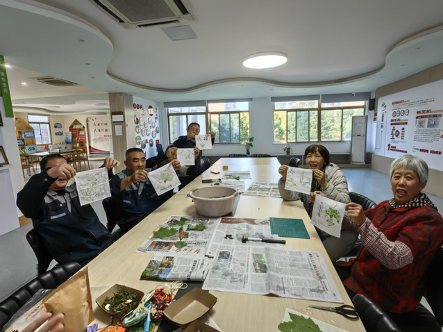 随后的重阳节文化宣讲中,手工体验热闹非凡。“植物拓印碰碰乐”环节里,老员工志愿者提前备好新鲜植物叶片与拓印材料,耐心示范操作步骤后,协助老人们将叶片纹理拓印在帆布包或方巾上,亲手制作独一无二的文创作品;茱萸香囊制作环节,大家跟着老员工志愿者学习研磨技巧、填香料、封边,一个个精致的香囊在指尖成型,散发着淡淡的草药香,寄托着健康平安的美好期许。