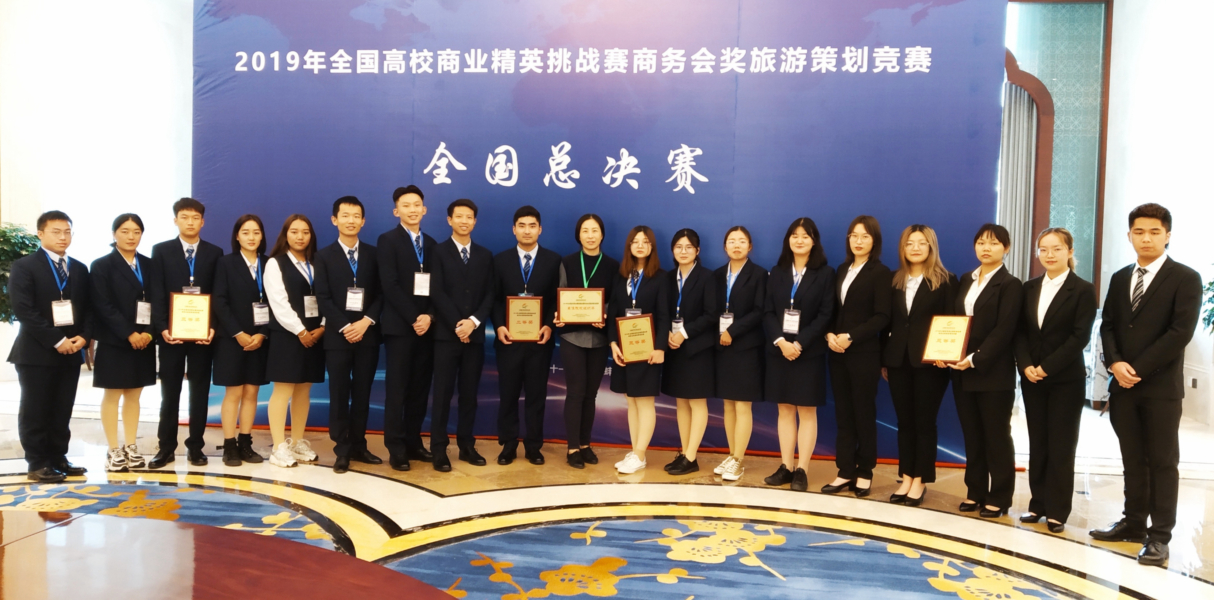 11月1日至2日,2019年全国高校商业精英挑战赛商务会奖旅游策划竞赛全国总决赛(以下简称全国总决赛)在安徽省蚌埠市举办。公司018级酒店管理专业18位同学组建的“古城寻文化·阿里走世界”“湖心珠月起·华帷承锦升”“谈古论今·湖月相伴”“流觞曲水·易赏古居”四支队伍全部入围全国总决赛,并获得一个二等奖、三个三等奖,同时公司荣获最佳院校组织奖。