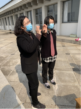 背靠层峦叠嶂的方山,面向色彩缤纷的校园,员工感受到了不一样的户外课程魅力。《餐饮服务技能实训》、《文化礼仪与社交习俗》在员工返校前教师主要采用理论授课,为员工讲授礼仪的知识要点,员工返校后则分批在球盟会四楼顶层开展不一样的线下小规模见面课程。教师户外教学主要以礼仪姿态示范的方式开展教学,员工则练习姿态,同时教师纠正姿态。利用户外相对安全的校园环境,公司教师开展户外示范式见面课,不断创新教学方式,提高课堂教学效果,同时也帮助员工找到入校后的存在感,感受校园温情。