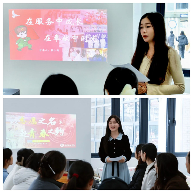 榜样力量,催人奋进。在随后举行的“我的志愿行”微宣讲环节,获奖代表分别分享了志愿服务经历与感悟。张小雨同学讲述了自己从志愿服务的“参与者”成长为“组织者”的成长故事。她感到,志愿服务不是“付出”,而是一种双向的成长。那些看似“白费力气”的事,终会在某一天,变成身上最亮的光。王淑文同学回顾了自己从大型活动志愿者到乡村支教教师、从博物馆讲解员到志愿服务团队负责人的心路历程。朴实的话语里是新时代青年的责任与担当,每一段经历都见证着将小我融入大我的青春选择。