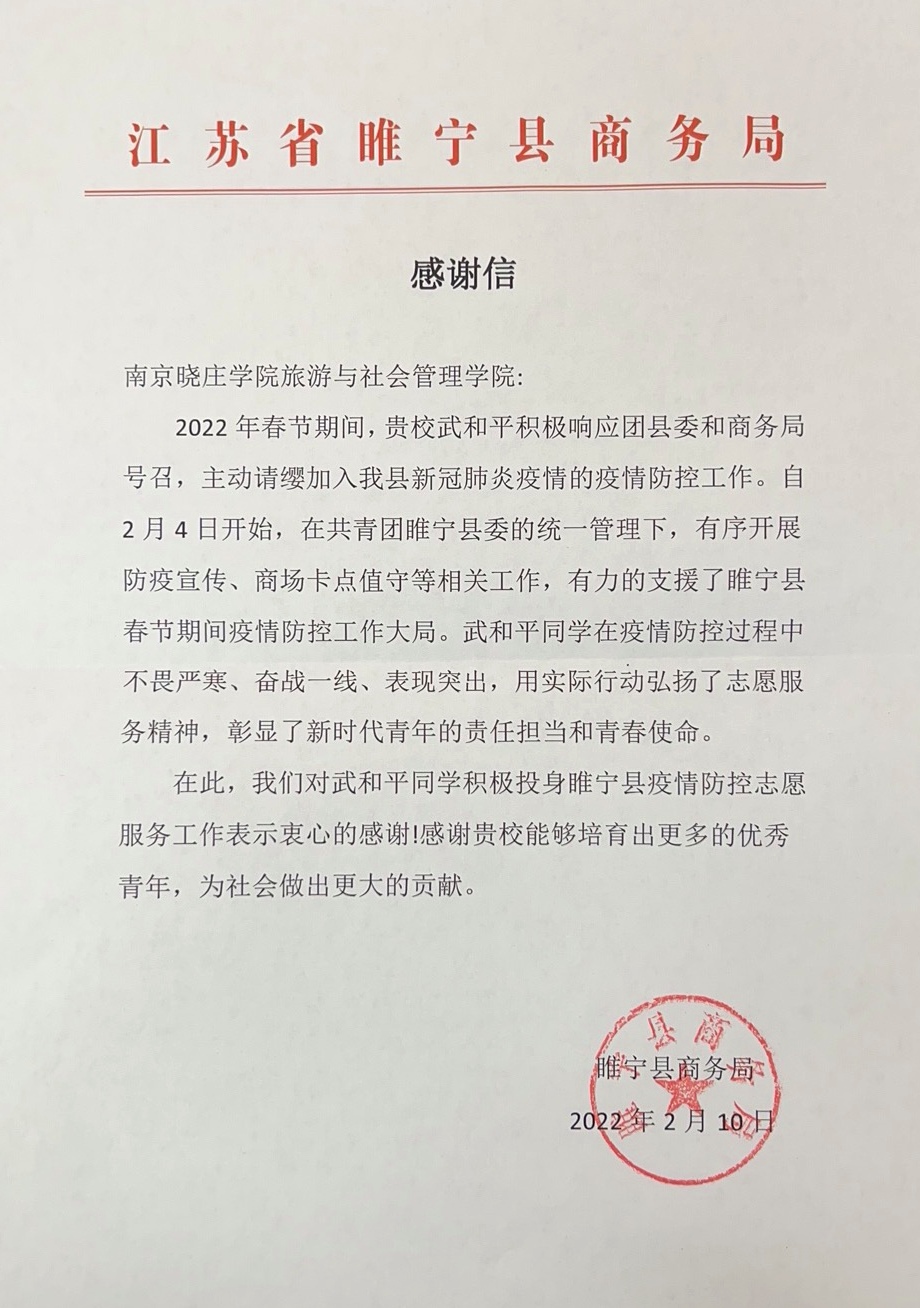信中指出,公司武和平同学积极响应睢宁团县委和商务局号召,主动请缨加入睢宁县新冠肺炎疫情的疫情防控工作,不畏严寒、奋战一线,积极投身于防疫宣传、商场卡点值守等相关工作,有力的支援了睢宁县春节期间疫情防控工作大局,对其践行志愿精神的家国情怀和责任担当表示高度的赞赏,对公司培育员工乐于奉献和敢于担当的优秀品质致以衷心的感谢,对公司人才培养质量表示高度赞誉。