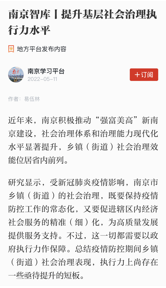 易伍林教授在文章中指出,在疫情防控期间,南京市乡镇(街道)在社会治理执行力上存在一些亟待提升的短板问题。同时,文章也对如何破解执行力困境、提升乡镇(街道)社会治理执行力水平提出了对策建议,对于南京市构建基层社会治理新格局,加快推进基层社会治理现代化具有重要影响。