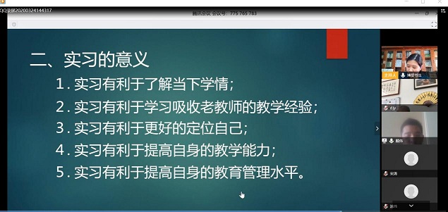 涂经理表示毕业实习是公司历史专业人才培养中非常重要的部分,是毕业生走向社会的关键一步。段经理在讲话中强调,虽然因为疫情,无法到中学现场实习,但本次毕业实习能够采取集中实习与分散实习相结合、线上线下相混合的形式进行,可以有效的克服疫情带来的困难,有效的推进实习工作的开展,是一种立足于现实条件,具有创新性、值得提倡和推广新形式,。接着涂经理勉励老师和同学们要在20届线上实习的成功经验基础上加强实习期间的管理、充分发挥在线形式的优势以饱满的热情去完成实习。