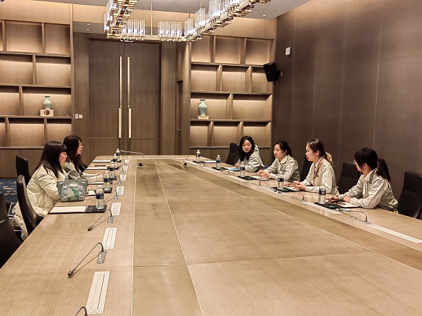 两位教师同实习生召开了座谈会。在座谈会上,两位老师向同学们表达了亲切慰问,对同学们吃苦耐劳的精神及取得的成绩表示了充分的肯定,两位老师鼓励同学们继续保持积极心态,尽心尽责投入到实习岗位中。会后,两位教师同酒店HR进行交流,双方就实习工作的具体内容、实习期间员工表现等内容进行了沟通。