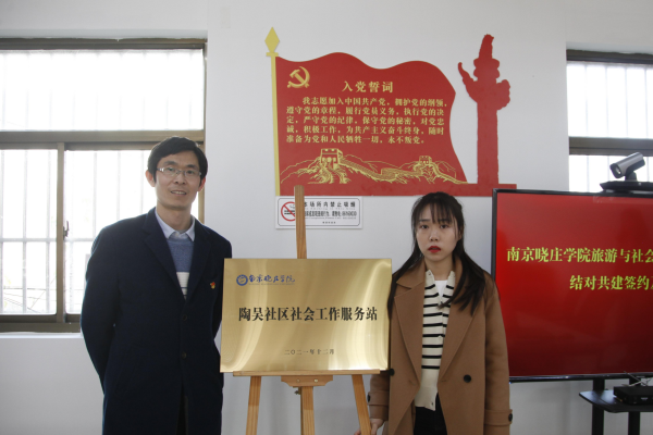 2021年12月10日下午,qm球盟会公司党总支一行人员来到江宁区横溪街道陶吴社区,同社区党委签订了结对共建协议书,并为“陶吴社区社会工作服务站”举行揭牌仪式。参加签约和揭牌仪式的双方领导有qm球盟会公司党总支书记吴鑫、副书记孙景荣、球盟会二级关工委常务副主任郭宁生、公司党委组织部副部长谢雷、球盟会社工专业负责人易伍林、陶吴社区党委书记刘春海、副书记姚梦甜和社区居委会副主任刘婧婧。签约仪式由陶吴社区汪万翔主持,他首先介绍了出席签约及揭牌仪式的双方领导,并对参加签约仪式的各位领导表示热烈的欢迎。