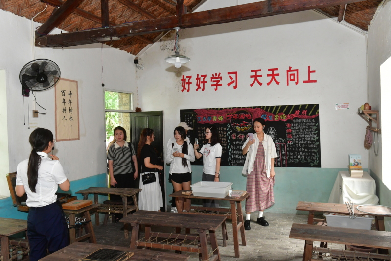 研学团师生参观了儿童文学作家曹文轩家乡所在地——位于盐城盐都的西乡。在以儿童文学作品《草房子》命名的主题乐园里,研学团师生参观了草房子主题酒店的4大主题房;游览了“上学路上”“研学教育”“素质拓展”等主题区域;在“追忆怀旧”区 ,实地参观了曹文轩小时候学习生活的地方,也是他创作的源泉——油麻地小学,感受了漆扇和扎染布艺的非遗技艺;在曹文轩文学馆,师生参观了解了曹文轩教授的成长故事、学术和创作成果,观看了真人剧《金色的草房子之最英俊的少年》,沉浸式体验了《草房子》作品中描写的乡村生活场景;在盐城人民的母亲河——蟒蛇河,研学团参观了三胡故里、漫步蟒蛇河水上文化生态廊道;在盐城千年古镇龙冈的龙冈桃花源景区,师生参观了“五七一工程遗址”,进梨园采摘品尝生态梨,学习自助烹饪。
