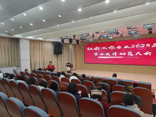 12月23日,旅游与社会管理公司在文北200报告厅召开社会工作专业2025届毕业生实习动员大会。公司领导、辅导员及社会工作专业师生出席大会,会议主要围绕毕业实习目的、内容、方式、安全和纪律等相关议题展开。